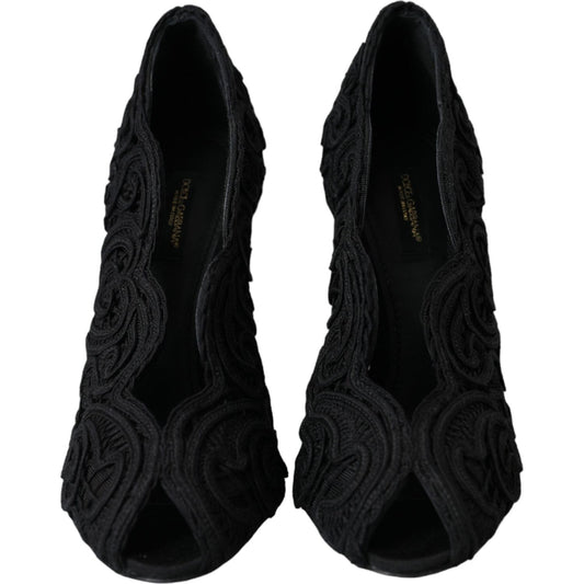 Dolce & Gabbana Black Cordonetto Ricamo Pump Open Toe Shoes