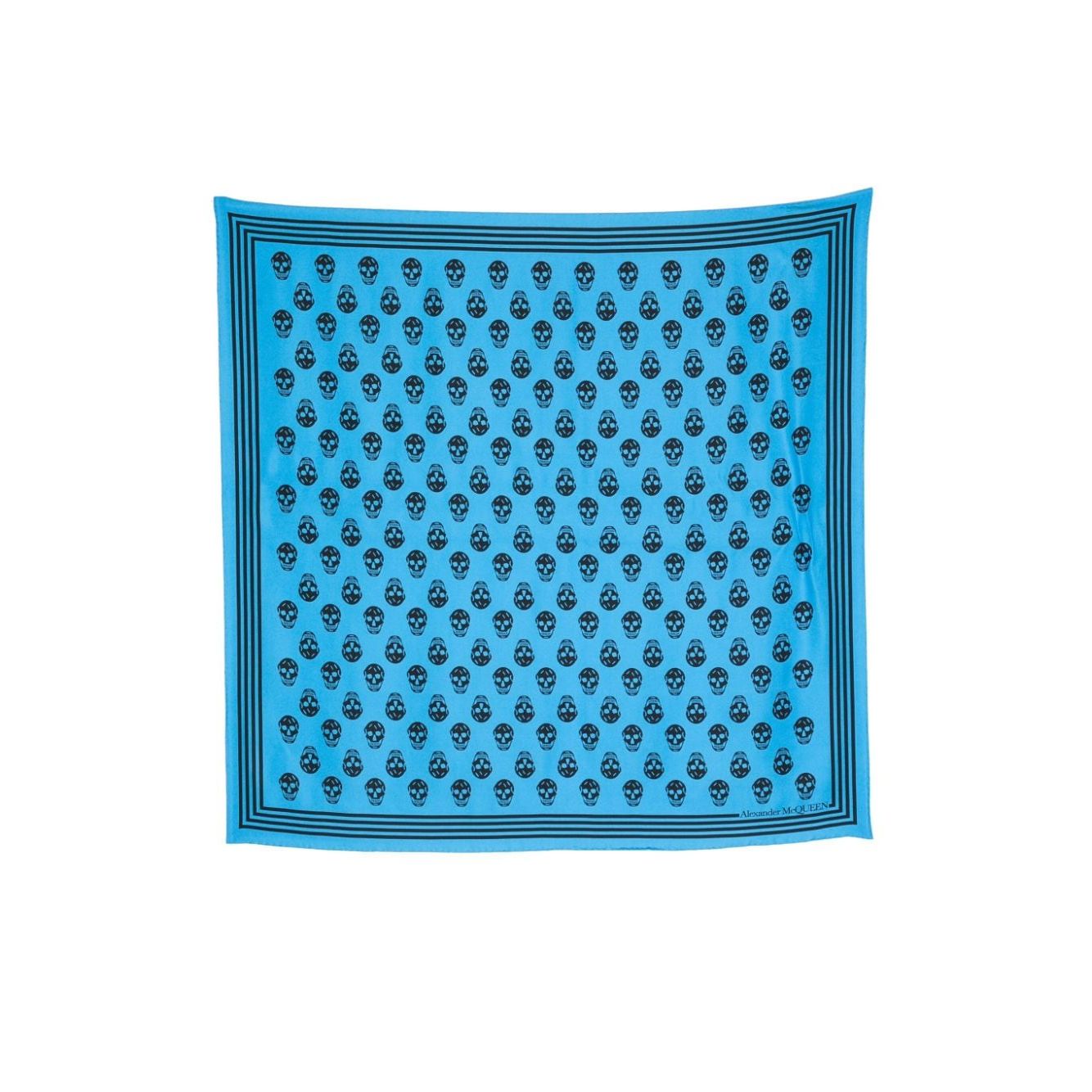 cerulean blue, black silk square shape skull print stripe detailing logo-print edge finished edge Skull silk scarf