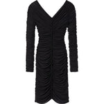 ruched off-shoulder dress from AZ FACTORY featuring black, stretch-design, off-shoulder, ruched detailing, ruffled detailing, long sleeves and thigh-length. V-neck short dress Size and Fit - This piece fits true to size. We recommend you get your regular size. Model is 1,75m / 5ft 8in wearing size 36 (FR)