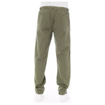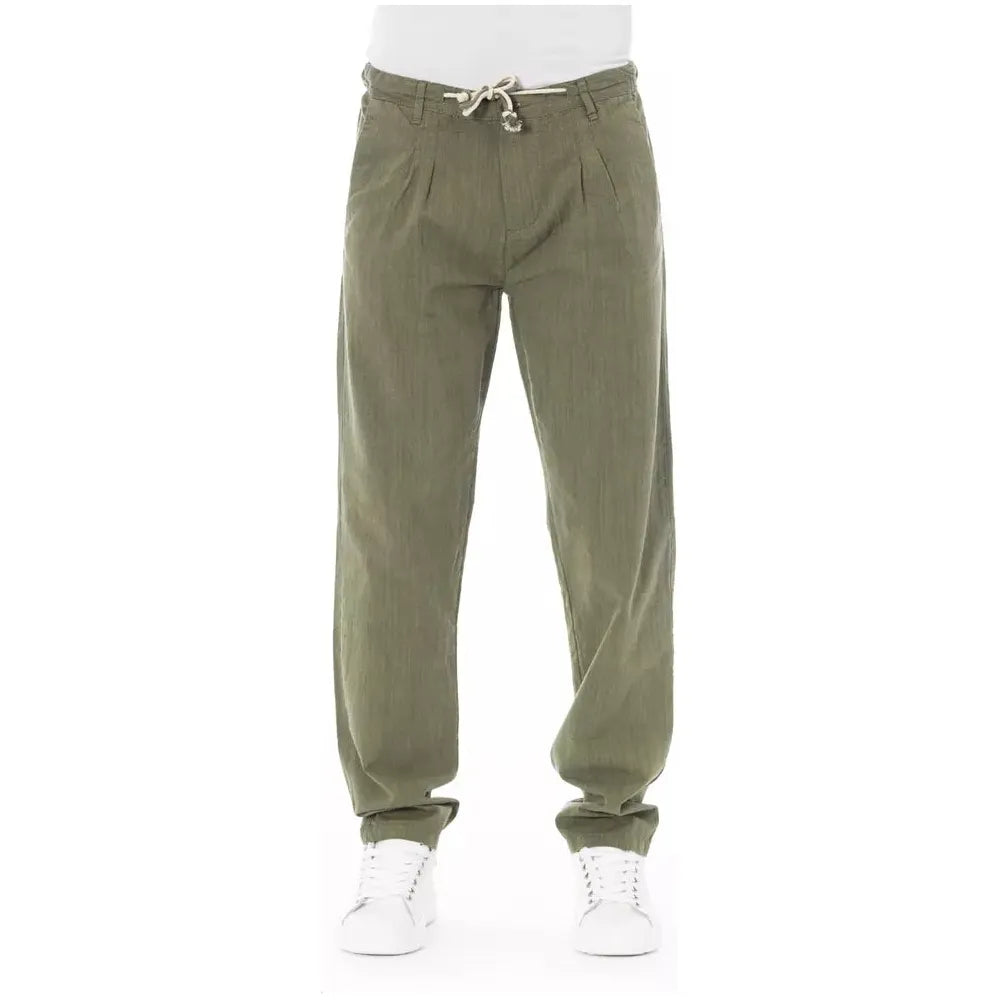 Elevate your style with Baldinini Trend’s precisely tailored chino trousers. Designed for the modern man, these pants feature a sharp front zipper and button closure, complemented by sleek side pockets and refined back welt pockets. Fashioned from premium 100% cotton for unmatched comfort and durability, each pair promises to enhance your ensemble with its chic army color. These trousers are a testament to Baldinini’s commitment to luxury and style perfection.