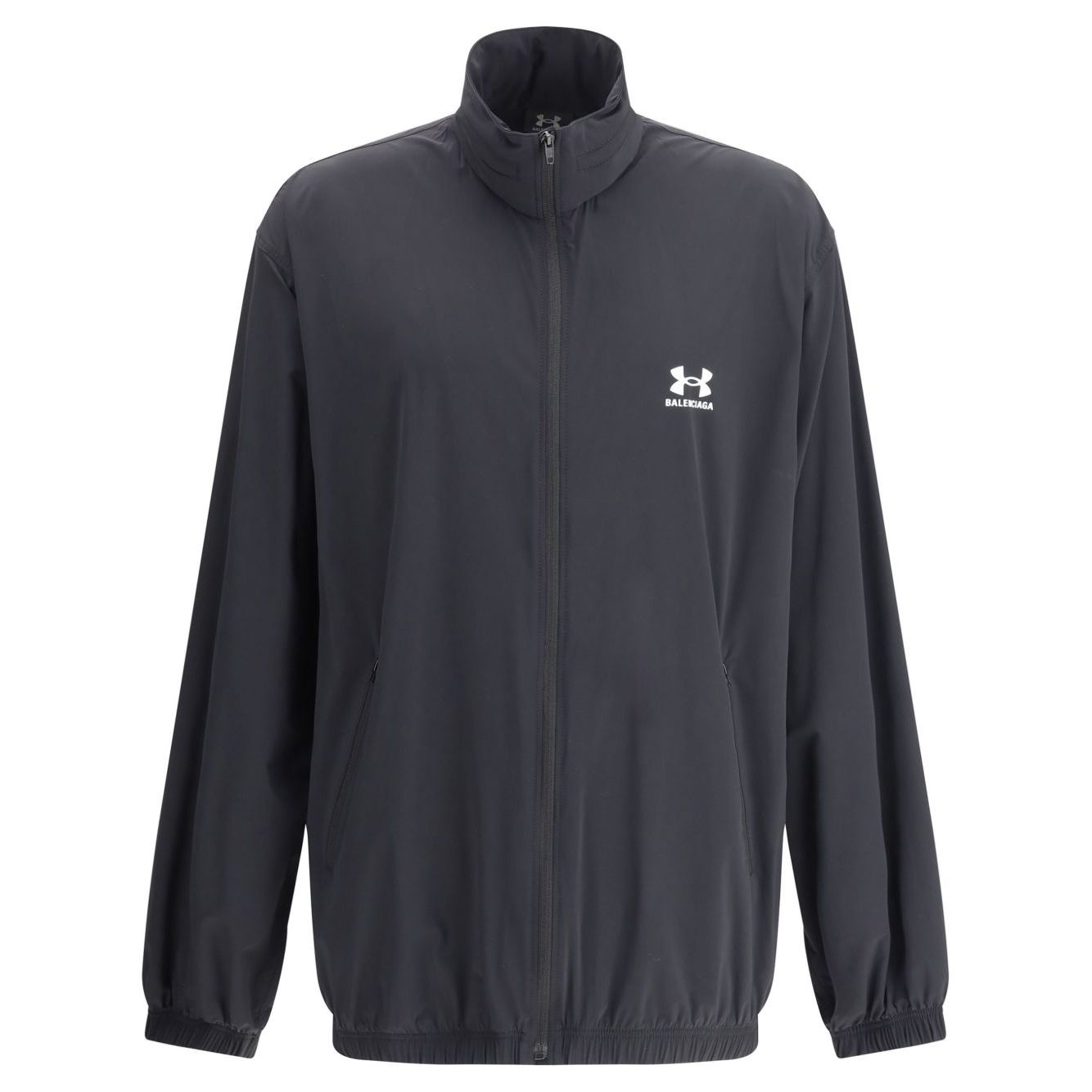 black front zip fastening high neck logo print to the front elasticated cuffs elasticated hem Balenciaga x Under Armour windbreaker Size and Fit - This piece fits true to size. We recommend you get your regular size. Model is 1,84m / 6ft 1in wearing size M