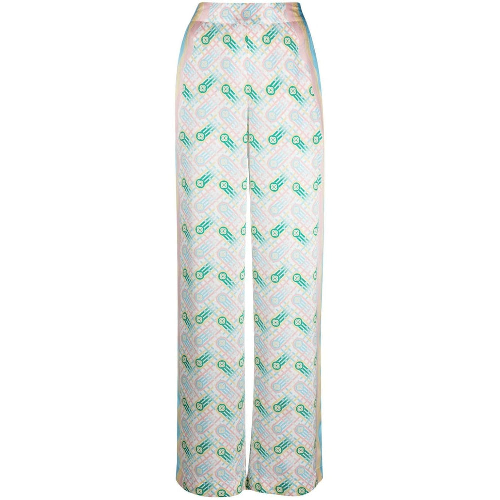 blue/multicolour silk satin finish all-over ping pong print high-waisted concealed side zip fastening two diagonal pockets to the sides straight leg Printed silk straight leg trousers Size and Fit - This piece fits true to size. We recommend you get your regular size. Model is 1,75m / 5ft 8in wearing size 36 (FR)