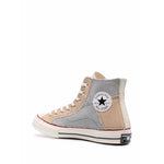 oatmeal-beige/grey canvas panelled design logo print to the side round toe front lace-up fastening ankle-length flatform sole Chuck 70 Hi sneakers Size and Fit - Heel 1,2 in / 3 cm; Platform 0,8 in / 2 cm