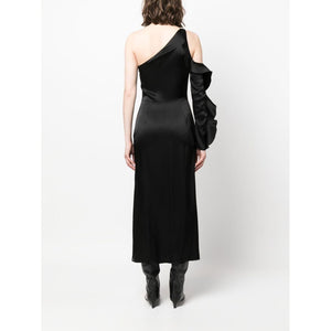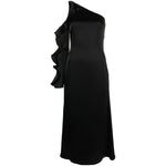 asymmetric ruffle-trim satin dress from DAVID KOMA featuring black, satin finish, asymmetric neck, ruffled detailing, single long sleeve, fitted waistline, concealed side zip fastening, empire line and mid-length. Ruffle detail one shoulder midi dress Size and Fit - This piece fits true to size. We recommend you get your regular size. Model is 1,75m / 5ft 8in wearing size 8 (UK)