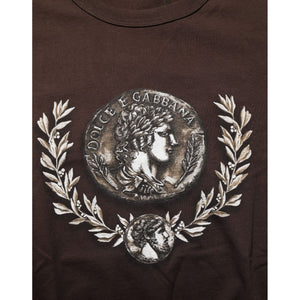 Gorgeous brand new, 100% Authentic Dolce & Gabbana brown T-shirt, featuring an intricate coin and laurel print for a classic, regal aesthetic. Crafted from premium cotton, this crew neck design offers a comfortable fit and elevated style, perfect for refined casual looks.