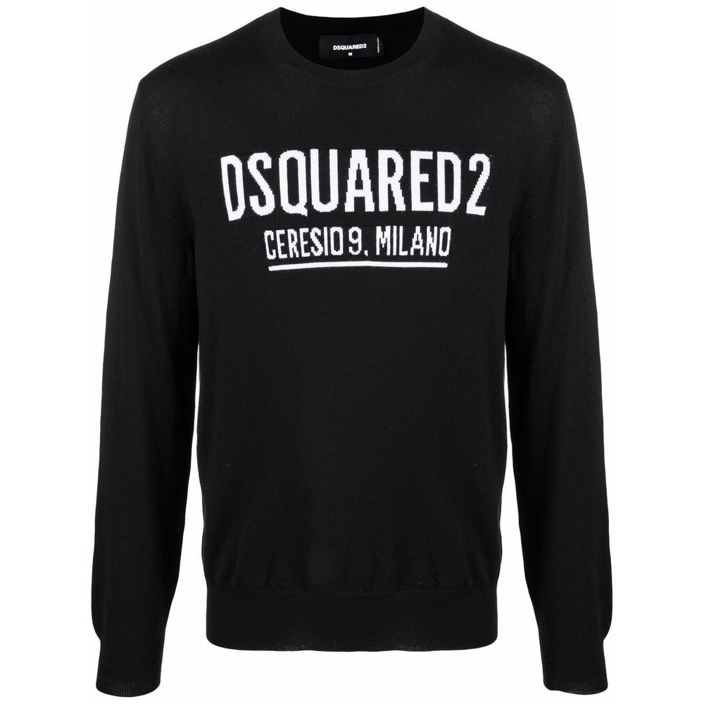 Black virgin wool logo intarsia-knit jumper from DSQUARED2 featuring crew neck, intarsia-knit logo, long sleeves, ribbed cuffs and ribbed hem. Ceresio 9 Cool cotton sweater Size and Fit - This piece fits true to size. We recommend you get your regular size. Model is 1,84m / 6ft 1in wearing size M