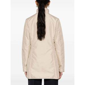 medium beige shell water-repellent grosgrain trim stand-up collar long sleeves two press-stud fastening side pockets unlined straight hem hook fastening front press-stud and two-way zip fastening Virginia Coat overcoat Size and Fit - This piece fits true to size. We recommend you get your regular size. Model is 1,75m / 5ft 8in wearing size S