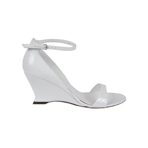 Sandalo bianco, con tacco, con laccio regolabile alla caviglia, con punta tonda. Size and Fit - Heel 3,1 in / 8 cm