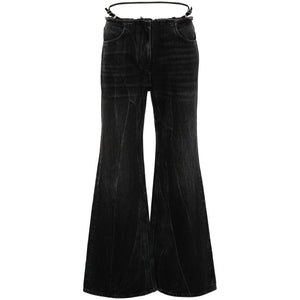 black cotton denim whiskering effect at the thighs belted waist frayed edge front press-stud and zip fastening flared two side inset pockets two rear patch pockets straight hem long length Wide-leg denim cotton jeans Size and Fit - This piece fits true to size. We recommend you get your regular size. Model is 1,75m / 5ft 8in wearing size 27 (WAIST CM)