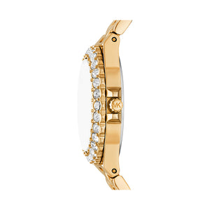 • Side view of MICHAEL KORS WATCHES Mod. MK7394 in gold with crystal accents and logo on the crown.