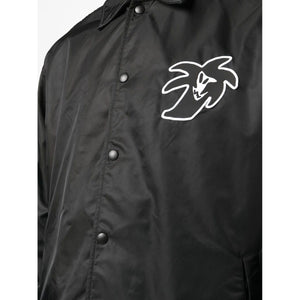 logo-patch lightweight jacket from PALM ANGELS featuring logo patch at the chest, logo patch to the rear, front button fastening, long sleeves, elasticated cuffs, two side welt pockets, straight hem, black and classic collar. Printed coach jacket Size and Fit - This piece fits true to size. We recommend you get your regular size. Model is 1,84m / 6ft 1in wearing size M