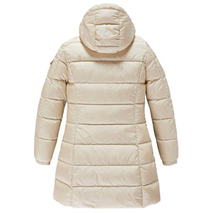 Refrigiwear long nylon down jacket with real down padding, hood with drawstring, button and zip fastening, two side pockets with zip fastening