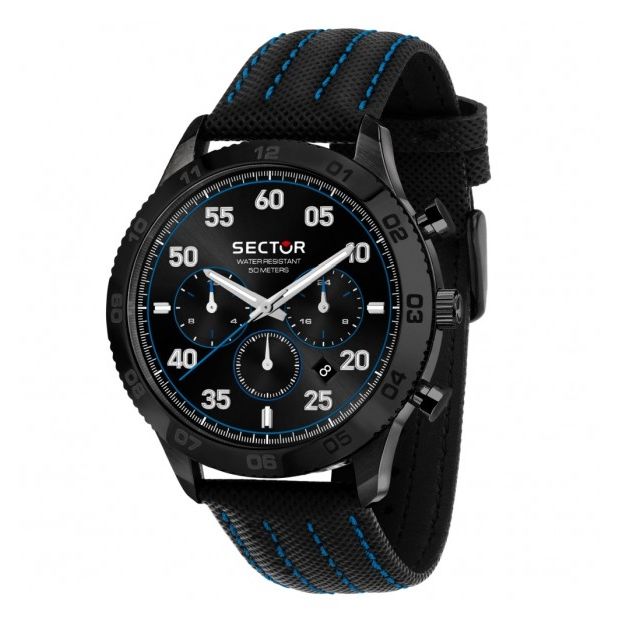 SECTOR Mod. 270 wristwatch with 45mm black stainless steel case, leather strap, quartz movement, chronograph, date display, and official box.