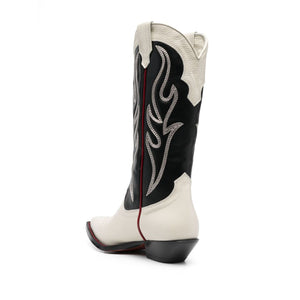 Santa Fe 50mm boots from Sonora featuring black/white, calf leather, decorative stitching, pull-on style, branded leather insole, mid block heel and pointed toe. Embroidered suede western boots Size and Fit - Heel 3,9 in / 10 cm; Platform 0,4 in / 1 cm