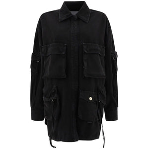 black cotton classic collar concealed front fastening long sleeves buttoned cuffs multiple cargo pockets curved hem Fern denim jacket Size and Fit - This piece fits true to size. We recommend you get your regular size. Model is 1,75m / 5ft 8in wearing size 40 (IT)