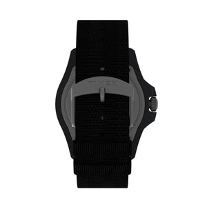 • TIMEX Mod. EXPEDITION SOLAR black wristwatch with fabric strap, 46mm plastic case, mineral dial, and solar quartz movement. Water resistant.